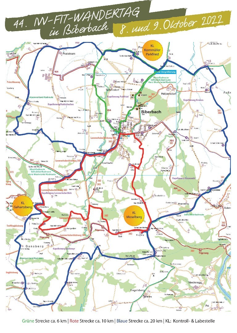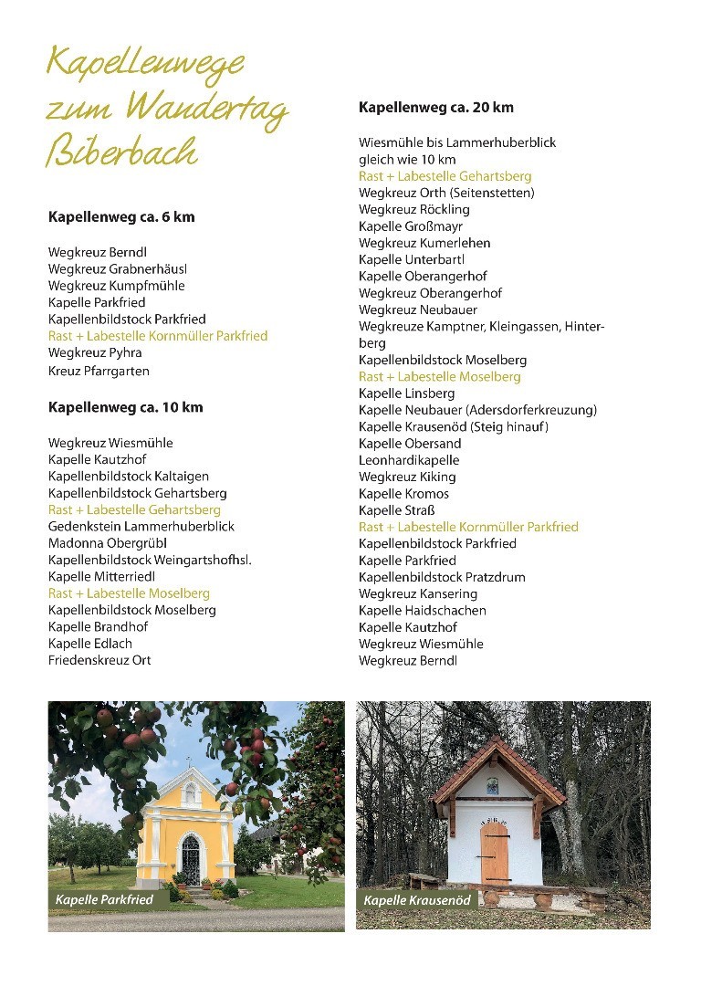3 Wanderwege: 6 km, 10 km, 20 km, 3 Rast- und Labestellen, Gehartsberg, Moselberg und ParkfriedKapellenwege zum Wandertag Biberbach