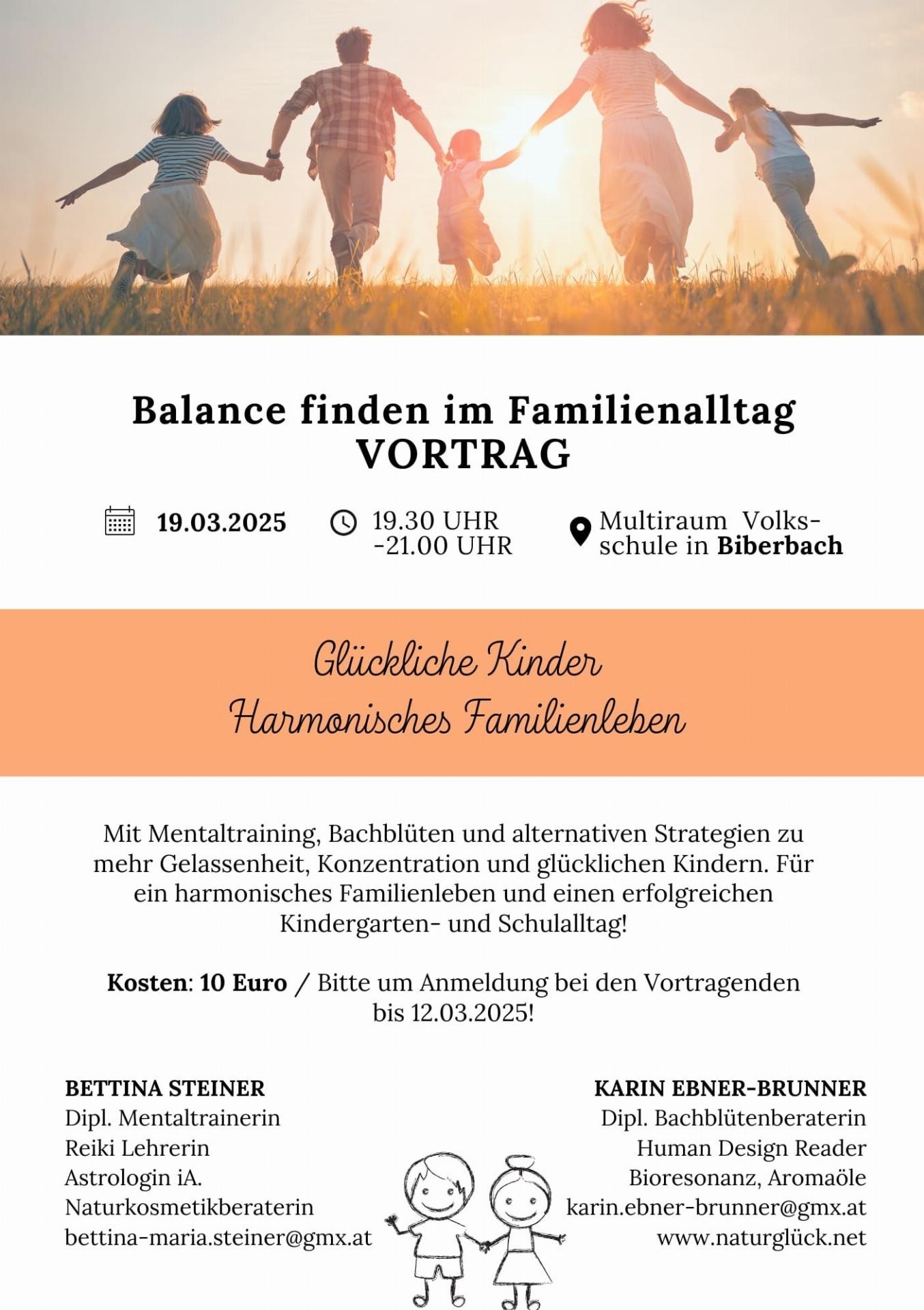 Mit Mentaltraining, Bachblüten und alternativen Strategien zu mehr Gelassenheit, Konzentration und glücklichen Kindern. Für ein harmonisches Familienleben und einen erfolgreichen Kindergarten- und Schulalltag! Kosten: 10 Euro / Bitte um Anmeldung bei den Vortragenden bis 12.03.2025!Glückliche Kinder Harmonisches Familienleben