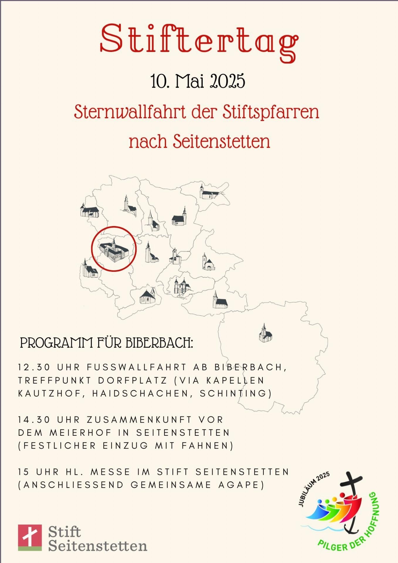 Fußwallfahrt nach Seitenstetten, 12.30 Uhr ab Dorfplatz Biberbach. 14.30 Uhr Treffen beim Meierhof zum feierlichen Einzug, 15 Uhr gemeinsame Messe im Stift Seitenstetten.