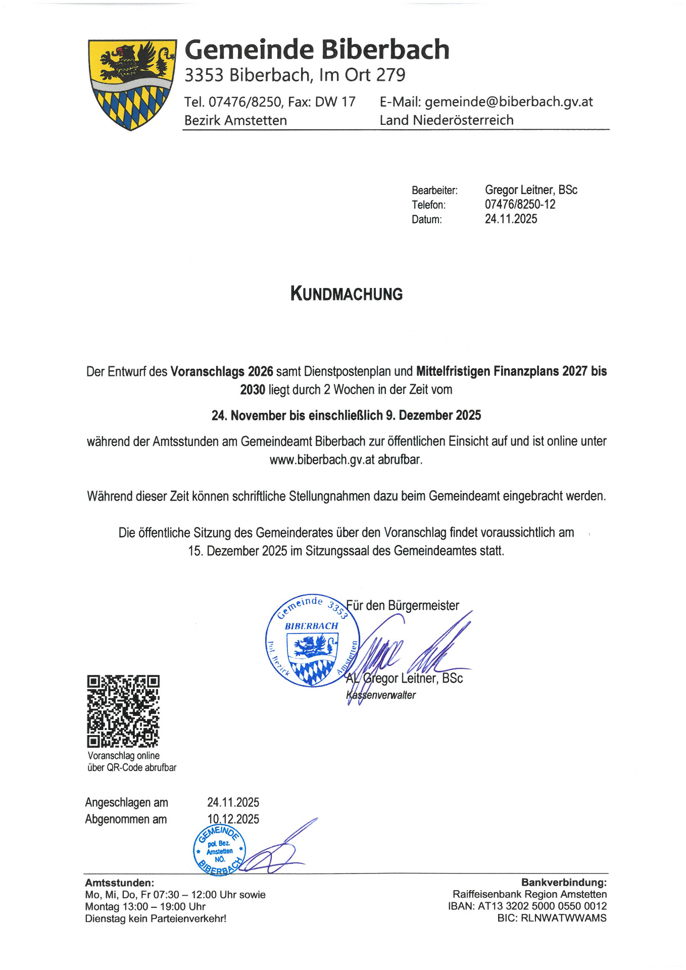 Die Einsicht in den Entwurf des Voranschlages 2026 samt Dienstpostenplan und Mittelfristigen Finanzplan 2027 - 2030 ist während der Amtsstunden am Gemeindeamt Biberbach möglich.