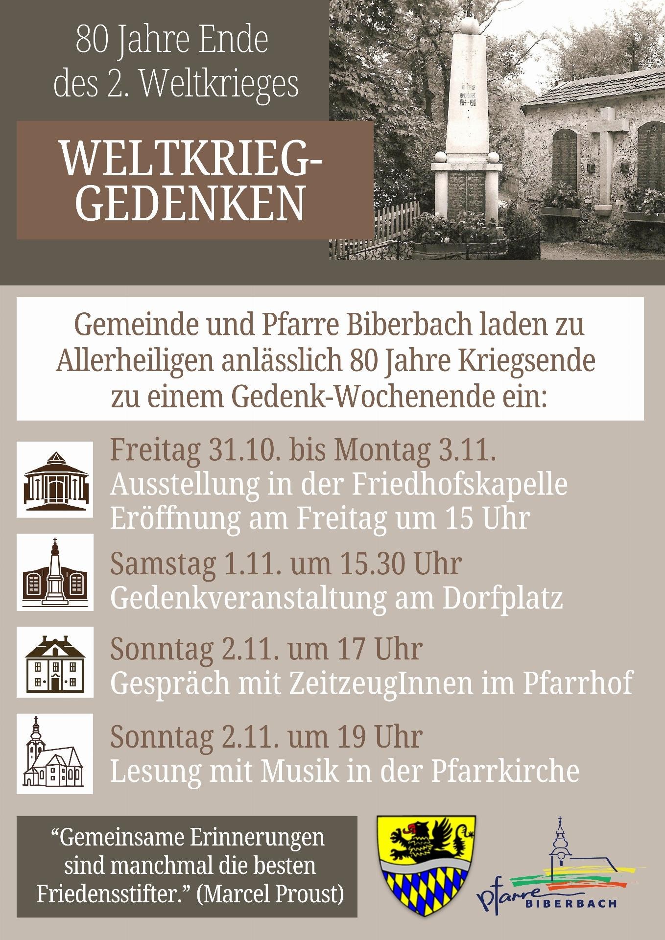 31.10.-3.11. Ausstellung in der Friedhofskapelle 1.11. 15.30 Uhr Gedenkveranstaltung am Dorfplatz 2.11. 17 Uhr Gespräch mit ZeitzeugInnen im Pfarrhof 2.11. 19 Uhr Lesung mit Musik in der Pfarrkirche80 Jahre Ende des 2. Weltkrieges